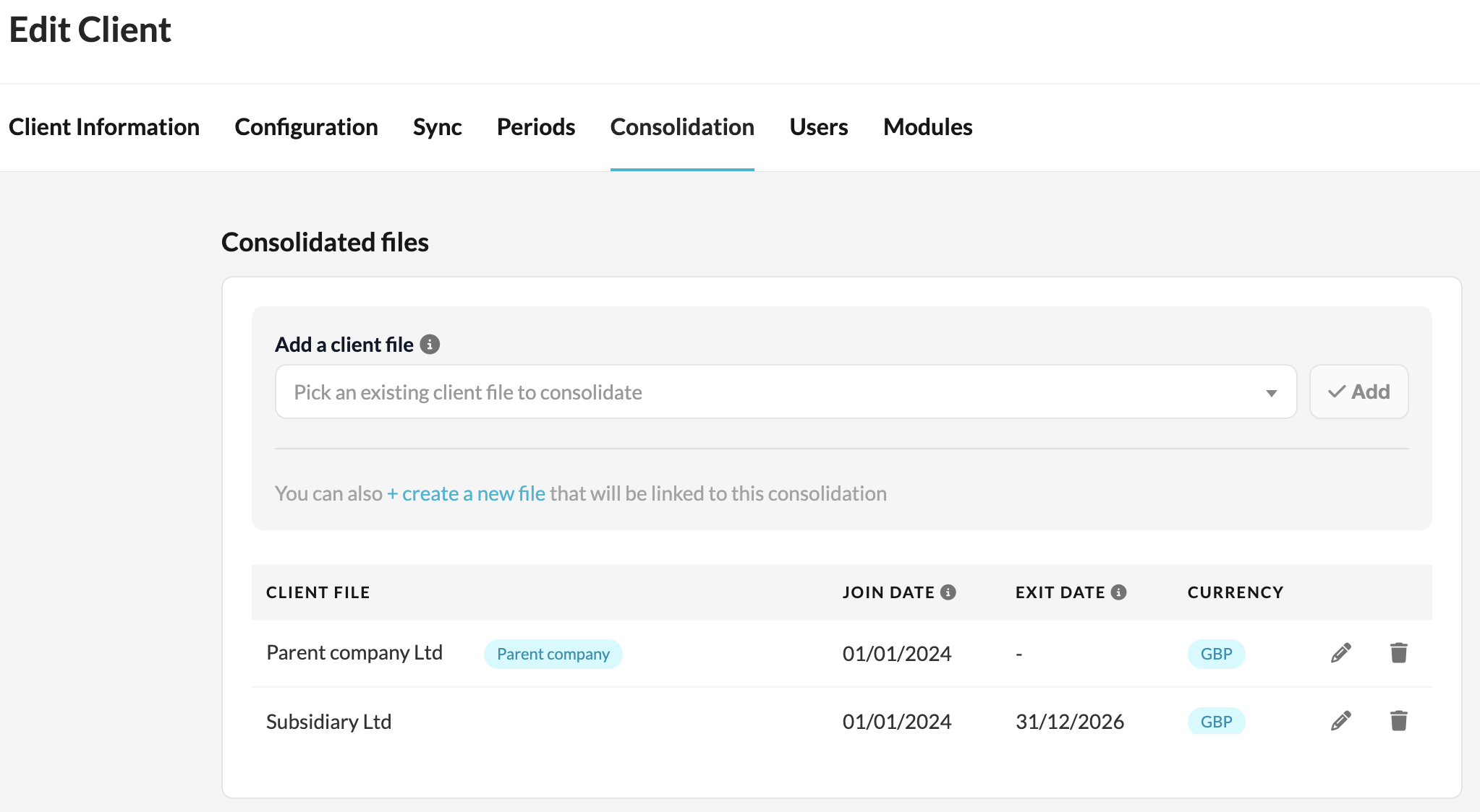 The list of companies included in the consolidation can be found under “Edit Client” → “Consolidation” tab. In this screen, users can add or remove companies and must select the parent company as well as the join and exit dates for each.