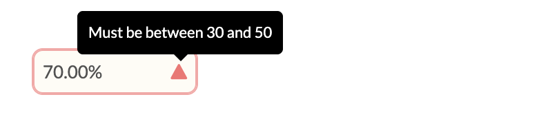 Input validation can also be applied to inputs defined as as:percentage. This allows to enforce a min and max percentage value using the same validation mechanism that already exists for numeric inputs.